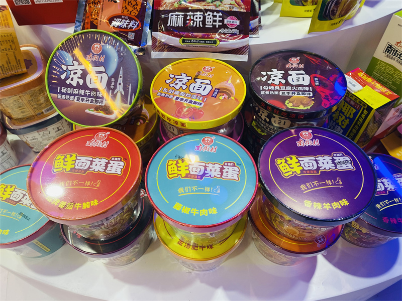 南街村的“北京方便面”曾是一代人童年的集体回忆,保持着原来的味道和低廉的价格吸引不少观众品尝。不过,随着当下消费潮流变化,为满足年轻消费群体的需求,南街村近年来也顺势推出“航天风格”的四款凉面产品。“不用煮、不用泡,只需打开盒子,把面和调料混合拌一拌即可大快朵颐,常温下可保存6个月。”该公司负责人笑着说,为品尝河南的“凉面”,外地展商拿出椰汁做交换。