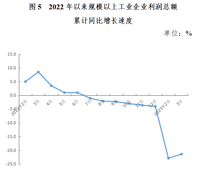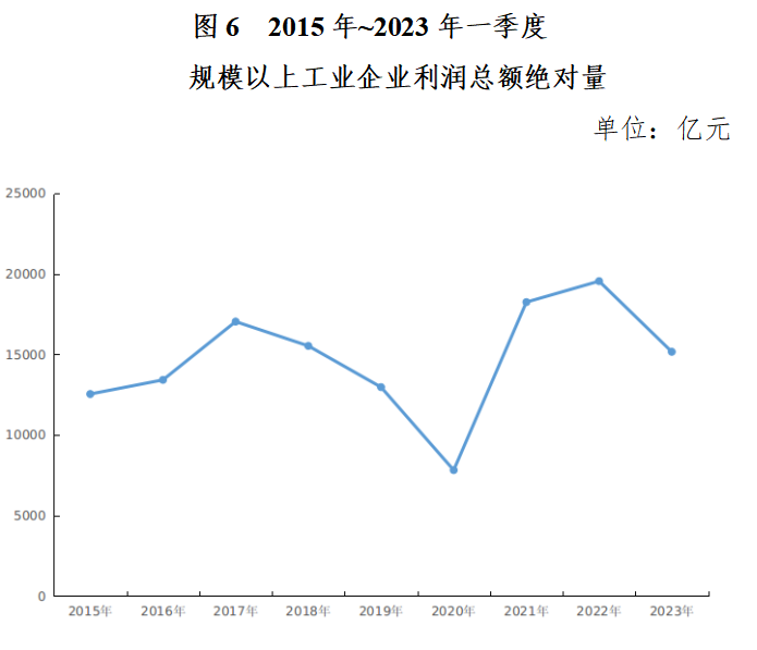 1-3月,全国规模以上工业企业实现利润总额15167.4亿元,同比下降21.4%,低于规上工业增加值增速24.4个百分点。从图5可以看出,2022年7月,规上工业企业利润总额同比增速由正转负,特别是2023年2月以来,增速较2022年降幅扩大。从图6可以看出,2023年一季度规模以上工业企业利润总额绝对量低于2021年、2022年同期水平。