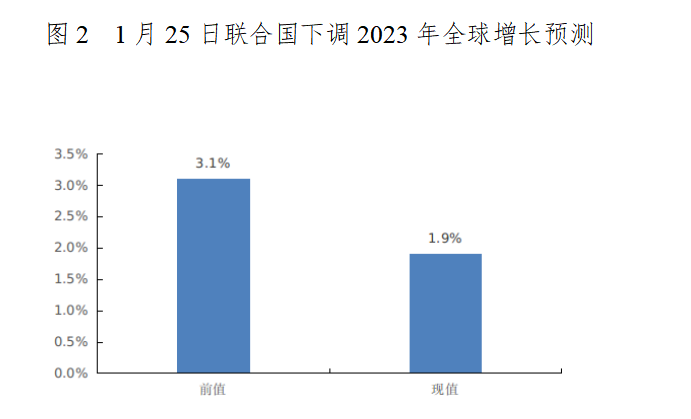 联合国1月25日发布《2023年世界经济形势与展望》报告预测,2023年世界经济增长将从2022年的约3%降至1.9%,比联合国在2022年5月份的预测前值3.1%,下调1.2个百分点。