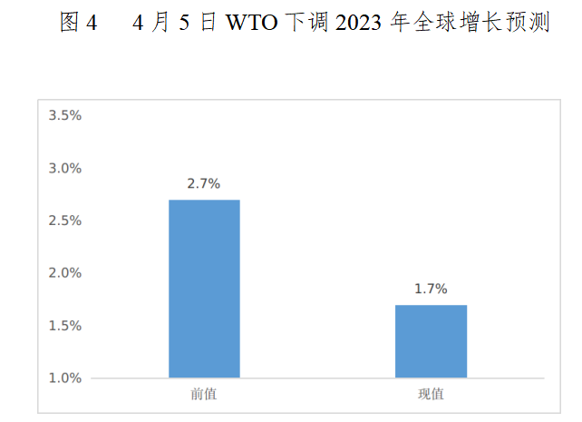 4月5日,世界贸易组织(WTO)发布最新一期《贸易统计及展望》报告指出,受俄乌冲突、居高不下的通胀、紧缩的货币政策和金融市场不确定性的影响,今年全球商品贸易量预计将增长1.7%,比2022年2.7%增速低1个百分点。