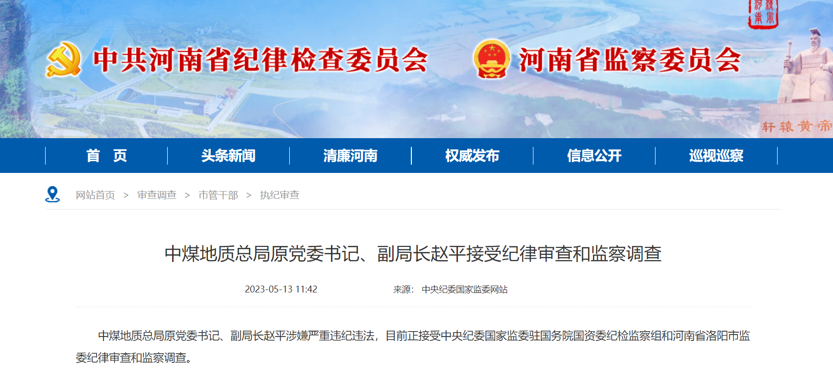 中煤地质总局原党委书记、副局长赵平涉嫌严重违纪违法,目前正接受中央纪委国家监委驻国务院国资委纪检监察组和河南省洛阳市监委纪律审查和监察调查。