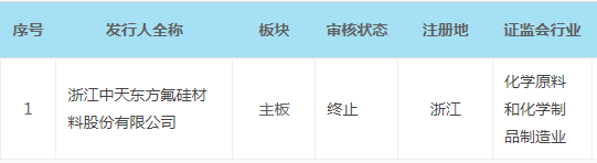 【大河财立方消息】5月15日,浙江中天东方氟硅材料股份有限公司沪市主板IPO审核状态变更为“终止”,原因系发行人及保荐机构撤回首发上市申请。该公司成为全面注册制下主板首单IPO终止案例。