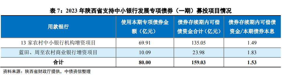 该期专项债规模80亿元,期限10年,全部为新增债券,品种为记账式固定利率附息债券。募集资金拟通过采用阶段性持股或转股协议存款的方式补充用款银行资本金,包括13家农村中小银行机构增资项目及蓝田、周至农村商业银行增资项目。