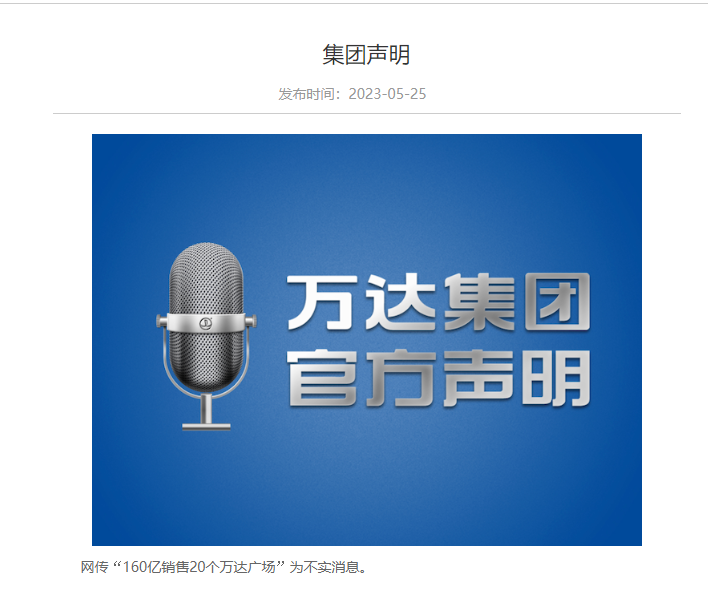 【大河财立方消息】5月25日,大连万达集团在官网发布声明称,网传“160亿销售20个万达广场”为不实消息。