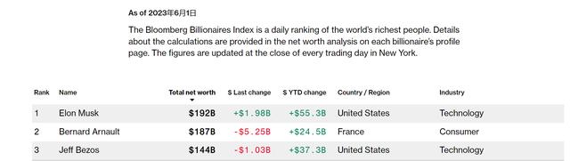根据彭博亿万富翁指数(Bloomberg Billionaires Index),马斯克目前的净资产约为1923亿美元,而Arnault的净资产约为1866亿美元。
