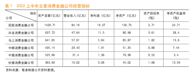 二是盈利分化,头部公司经营较为稳健。2022年上半年,招联消费金融公司、兴业消费金融公司、马上消费金融公司营业收入分别为84.16亿元、47.64亿元和57.01亿元,净利润分别为19.37亿元、11.5亿元、5.84亿元。其余消费金融公司净利润均在5亿元以内,且有6家出现亏损或利润负增长。