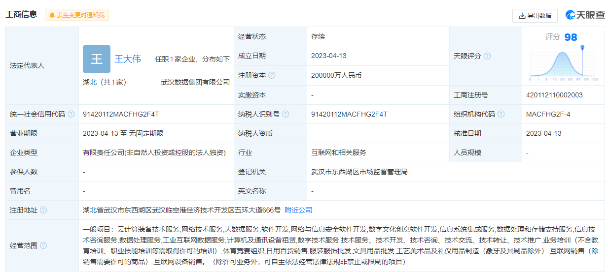 另据天眼查显示,武汉数据集团有限公司已于4月13日完成注册,法定代表人为王大伟。