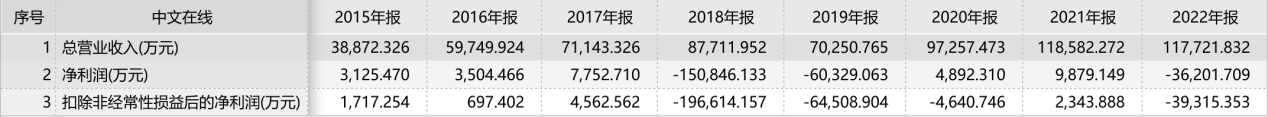 通过历史数据发现,中文在线存在业绩波动大和巨额亏损情况。据统计,中文在线上市至今亏损共计29.57亿元,对比公司17.72亿元的总资产算,亏损了近1.7倍公司总资产。