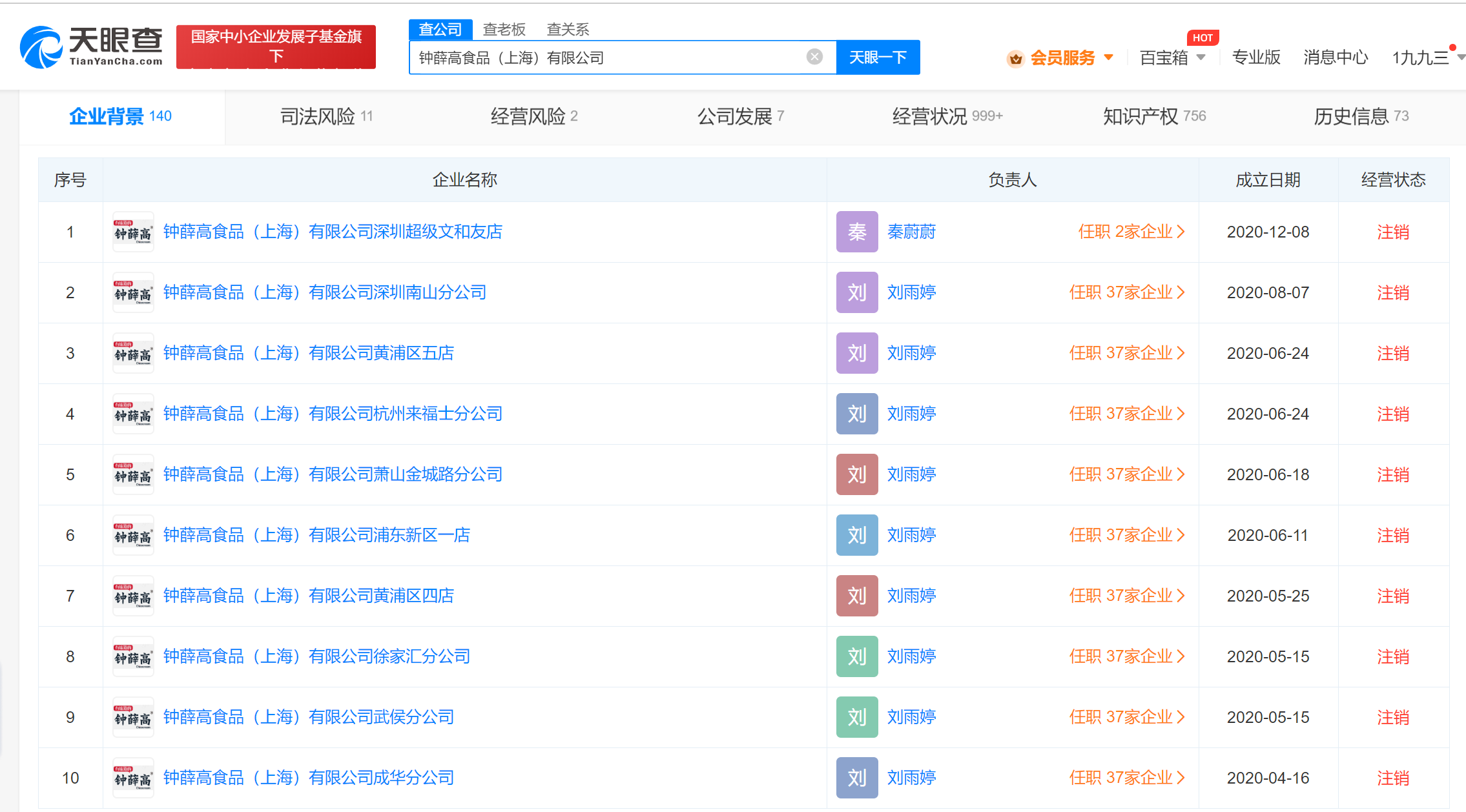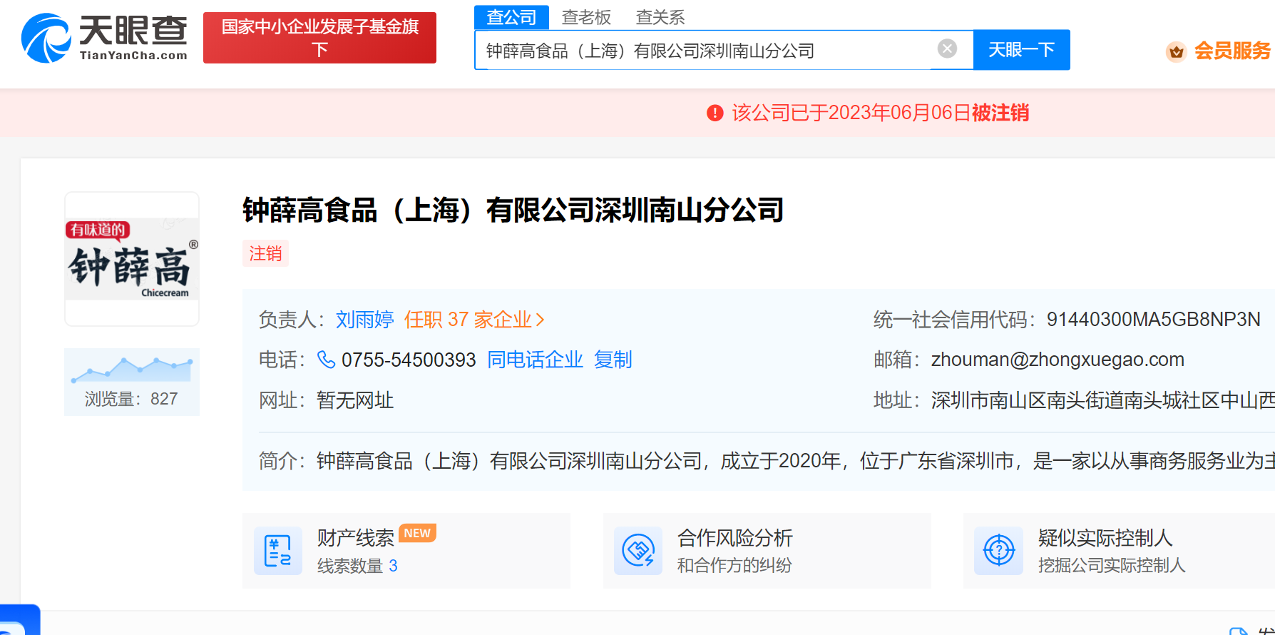 【大河财立方消息】天眼查App显示,近日,钟薛高食品(上海)有限公司深圳南山分公司经营状态由存续变更为注销。该分公司成立于2020年8月,负责人为刘雨婷。