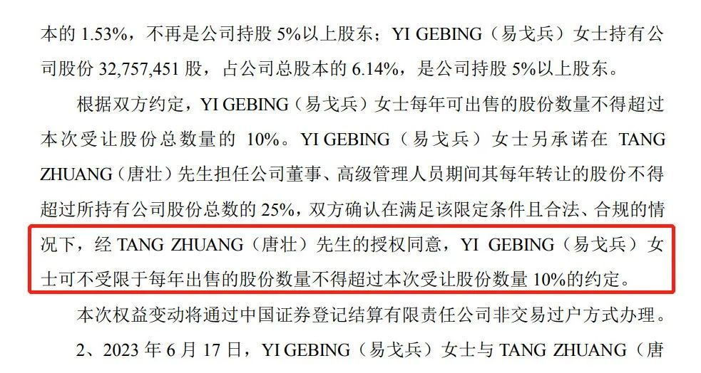 根据双方约定,易戈兵每年可出售的股份数量不得超过本次受让股份总数量的10%。易戈兵另承诺在唐壮担任公司董事、高级管理人员期间其每年转让的股份不得超过所持有公司股份总数的25%,双方确认在满足该限定条件且合法、合规的情况下,经唐壮的授权同意,易戈兵可不受限于每年出售的股份数量不得超过本次受让股份数量10%的约定。