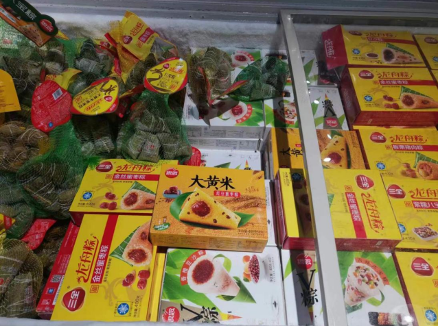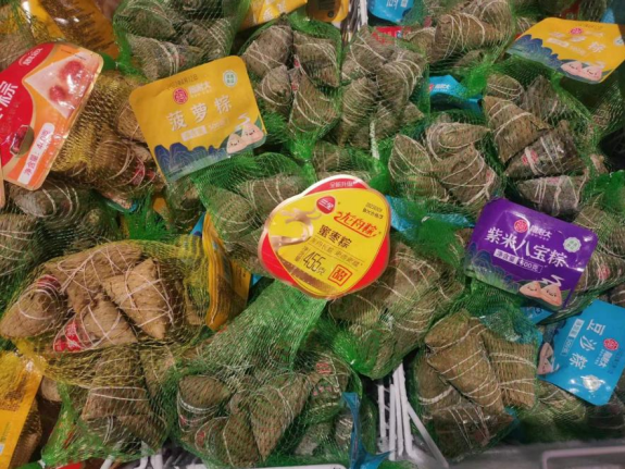 “杂粮粽子不是说不用糯米了,像大黄米红豆蜜枣粽和紫糯八宝粽是由大黄米、紫米和糯米均衡搭配,毕竟糯米的口感是不可取代的。今年端午,像大黄米和板栗猪肉的粽子卖得都比较好,马上就过端午节了,好多粽子都是‘买一赠一’。”超市工作人员说道。