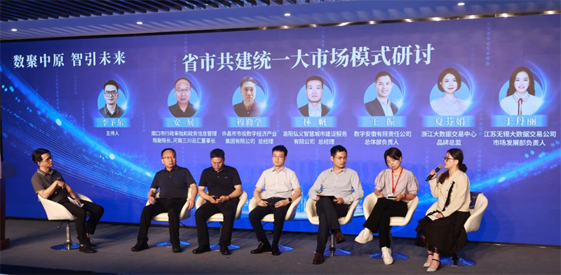 在省市共建统一大市场模式分享和研讨环节,郑州数据交易中心相关负责人分享了河南省数据要素市场培育实践方面的特色探索经验,并邀请周口市行政审批和政务信息管理局、河南三川云汇信息服务有限公司、许昌市市投数字经济产业集团有限公司、洛阳弘义智慧城市建设服务有限公司、数字安徽有限责任公司、浙江大数据交易中心、江苏无锡大数据交易公司等嘉宾,围绕“省市共建统一大市场模式”主题进行了圆桌讨论。