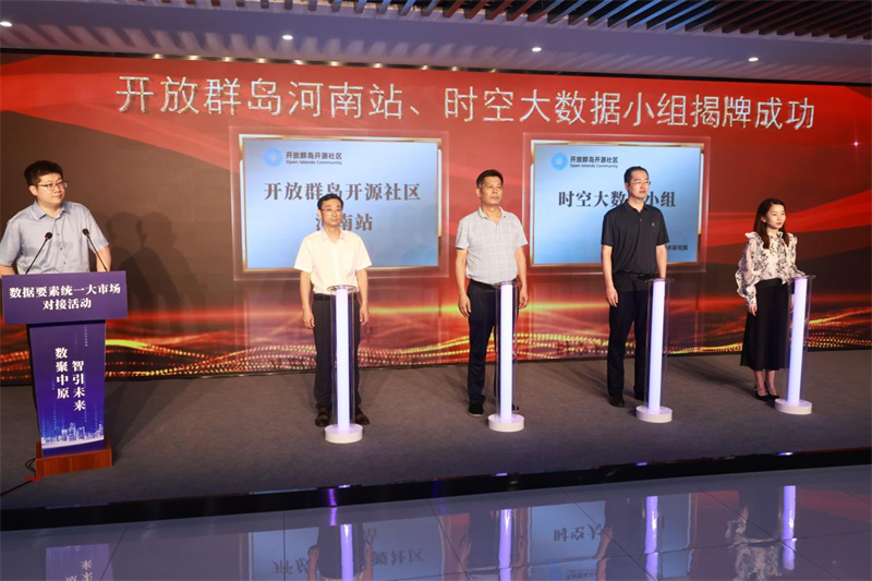 活动现场,周行民、张西原、郑州数据交易中心总经理潘新民、开放群岛开源社区运营组组长潘菲共同为开放群岛开源社区河南站、时空大数据小组揭牌。