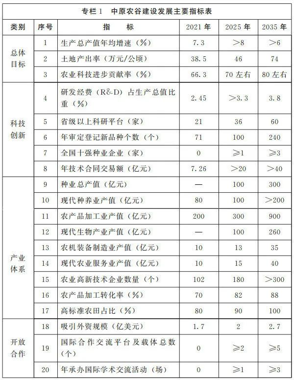 到2035年,建成世界一流的农业科技基础设施集群、科研试验示范基地集群和全球粮食科技创新高地,成为国家农业科技自立自强的主要战略力量,深度融入“一带一路”农业科技创新体系,全球十强种业企业培育实现新的突破,打造形成千亿级种业、粮食产业集群,中原农谷科技创新力、产业竞争力、品牌影响力跻身世界先进行列。