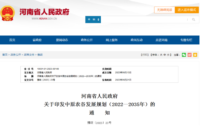 【大河财立方消息】日前,河南省人民政府印发《中原农谷发展规划(2022—2035年)》(下称规划),大河财立方记者获悉,规划旨在发挥中原农谷示范引领带动作用,更好支撑建设供给保障强、科技装备强、经营体系强、产业韧性强、竞争能力强的农业强省,探索走出一条具有河南特色的农业农村现代化之路。