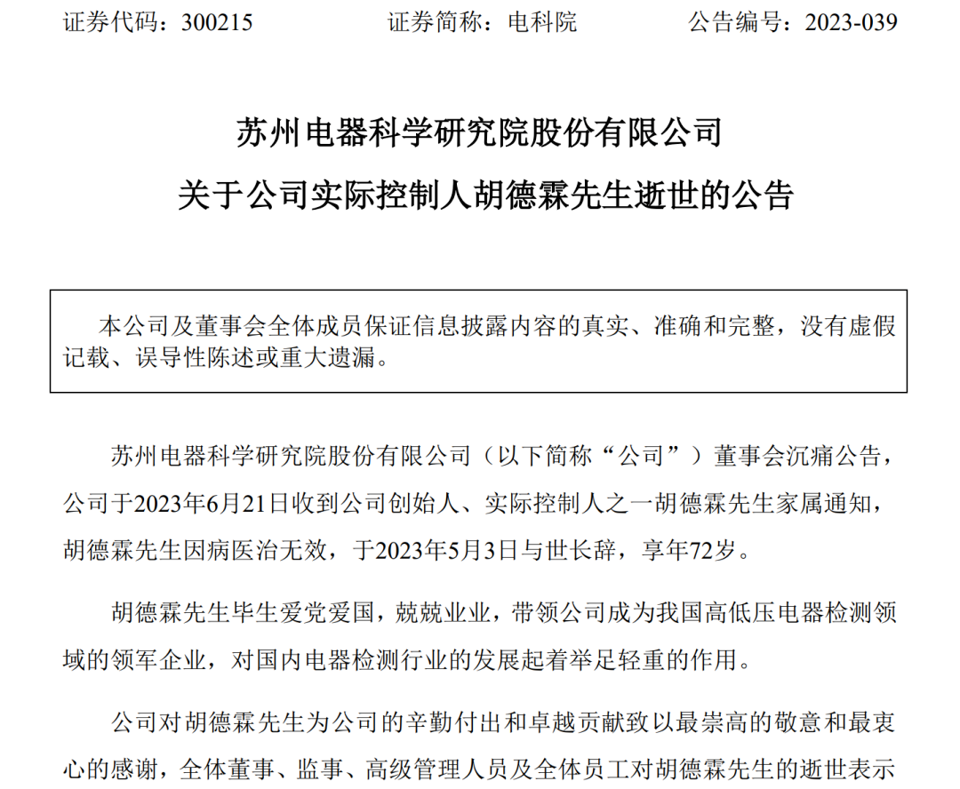 6月26日晚间,电科院(300215)公告,公司6月21日收到公司创始人、实际控制人之一胡德霖家属通知,胡德霖因病医治无效,于2023年5月3日与世长辞,享年72岁。