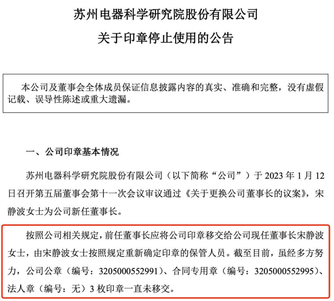 4月7日,电科院公告了关于前董事长胡醇侵占印章事件的最新进展,公告称,前任董事长胡醇一直未按规定,将公司公章、合同专用章和法人章移交给新任董事长宋静波,公司决定停止使用这3枚印章。
