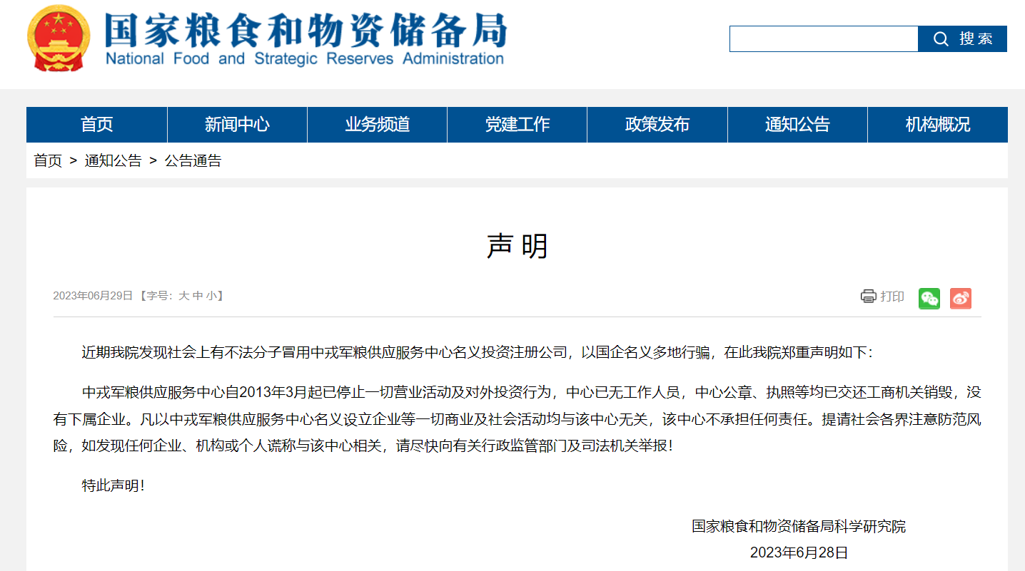 【大河财立方消息】6月29日,国家粮食和物资储备局科学研究院发布声明,近期社会上有不法分子冒用中戎军粮供应服务中心名义投资注册公司,以国企名义多地行骗。