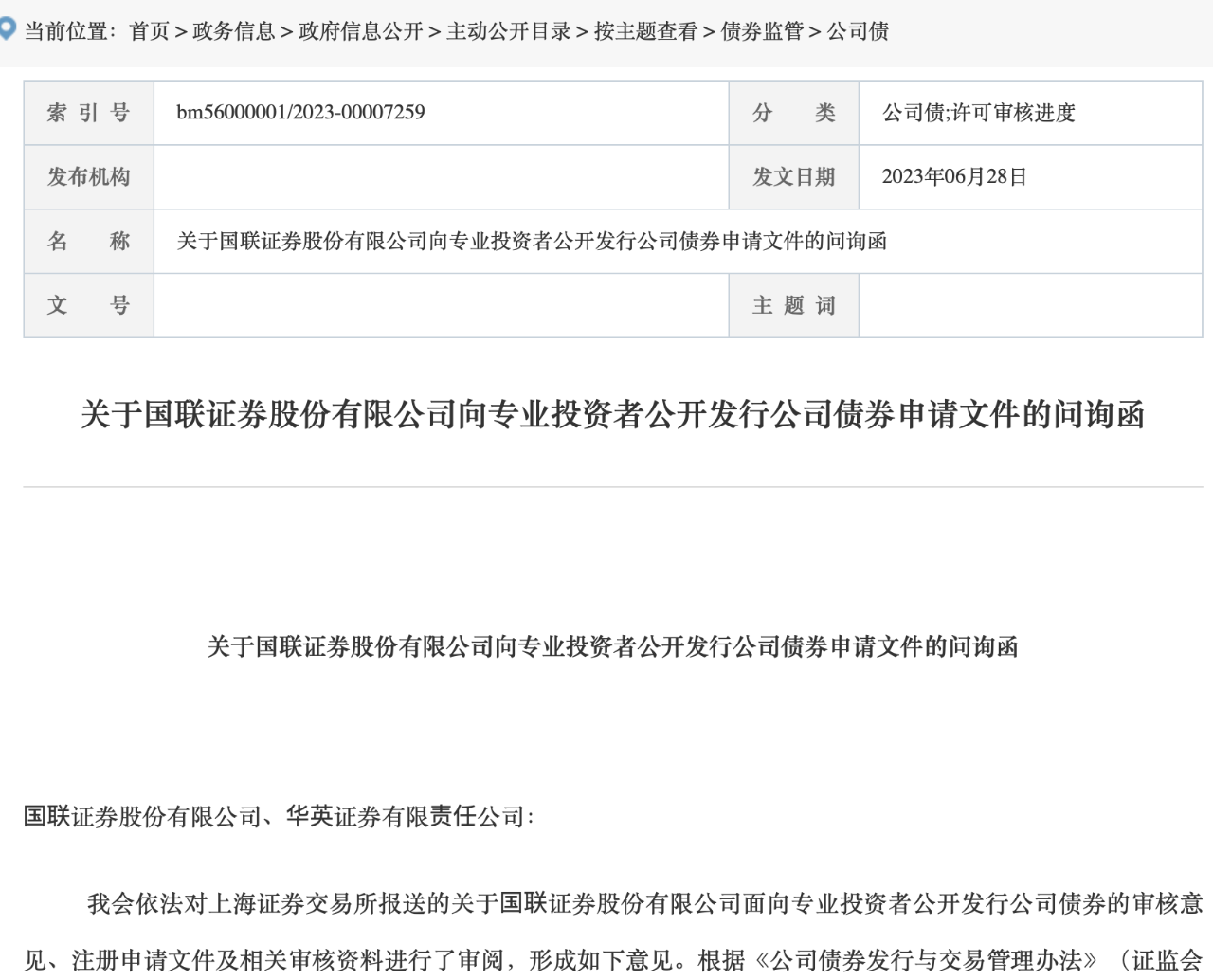 6月28日,中国证监会公布了一则问询函,针对上交所报送的关于国联证券面向专业投资者公开发行公司债券的相关审核资料,要求国联证券及相关中介机构,就国联证券控股股东国联集团收购民生证券30.3%股权的进展,及可能产生的影响进行补充核查并发表明确意见。