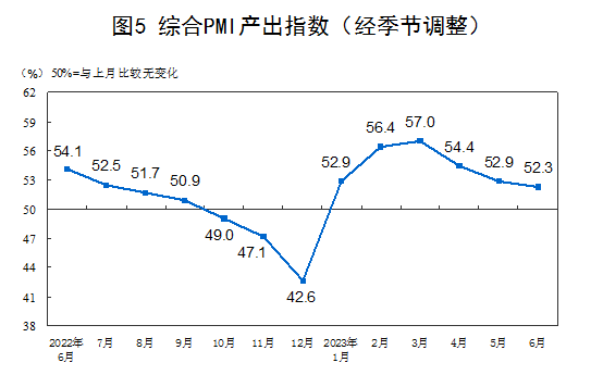 6月份,综合PMI产出指数为52.3%,比上月下降0.6个百分点,继续位于扩张区间,表明我国企业生产经营总体延续扩张态势。