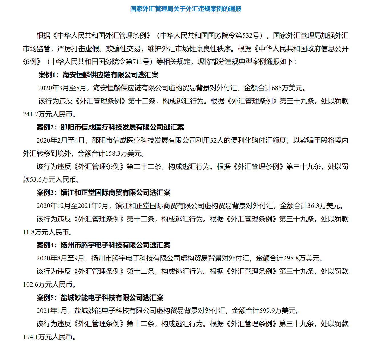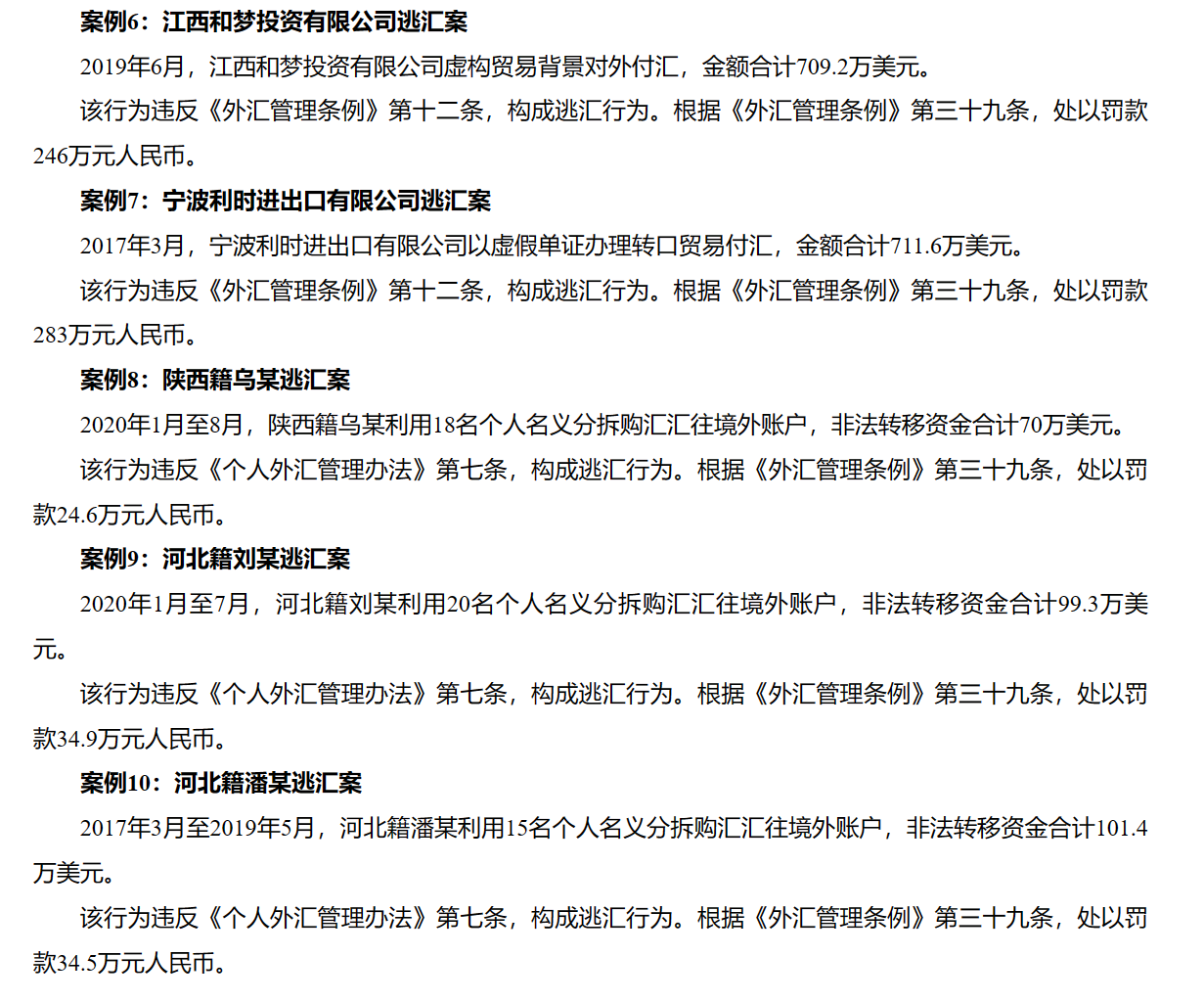 6月29日,国家外汇管理局通报了10起逃汇案。上述案件均发生在2017年至2020年,涉及逃汇金额总计3469.8万美元,共处罚款1226.8万元。