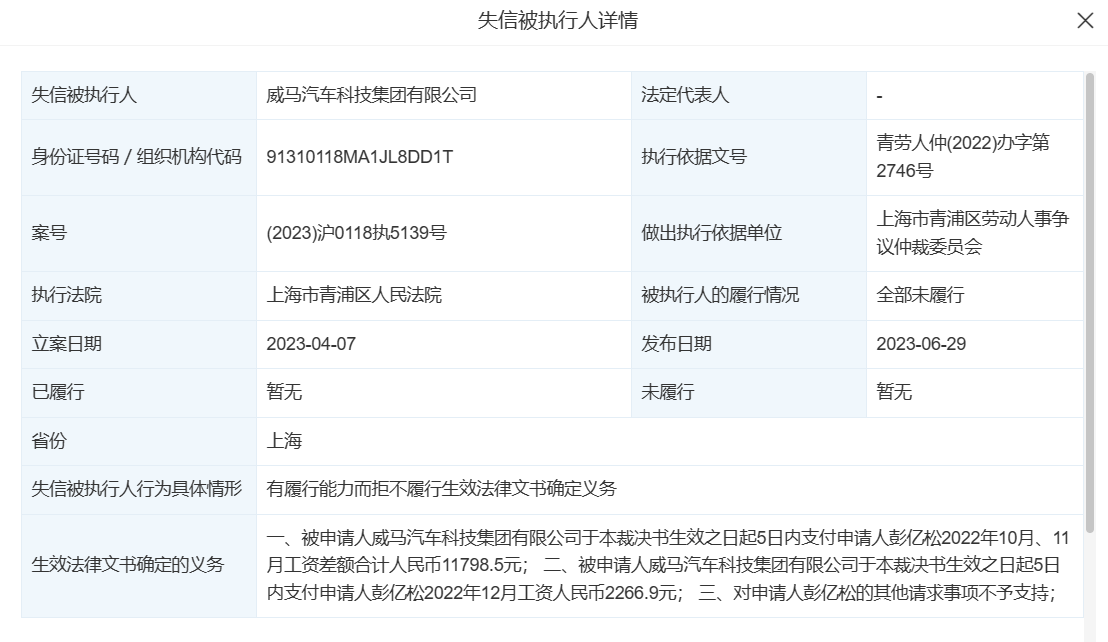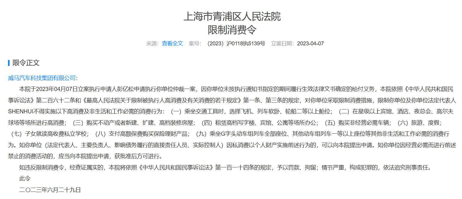 【大河财立方消息】天眼查App显示,近日,威马汽车科技集团有限公司及董事长SHEN HUI(沈晖)新增一则限制消费令,申请人为彭某某,涉及仲裁案件,执行法院为上海市青浦区人民法院,同时,该公司还因此案被列为失信被执行人(老赖)。