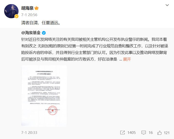 对此,海泉基金回应称,已经第一时间完成了行业规范自查和整改工作,胡海泉也在微博回应:“清者自清”。