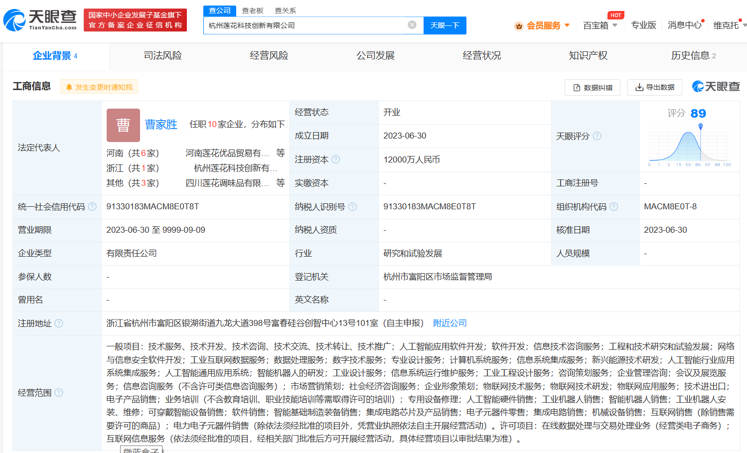 【大河财立方消息】天眼查App显示,近日,杭州莲花科技创新有限公司成立,法定代表人为曹家胜,注册资本1.2亿人民币,经营范围包括人工智能应用软件开发、新兴能源技术研发、智能机器人的研发、物联网技术研发、可穿戴智能设备销售、集成电路芯片及产品销售等。