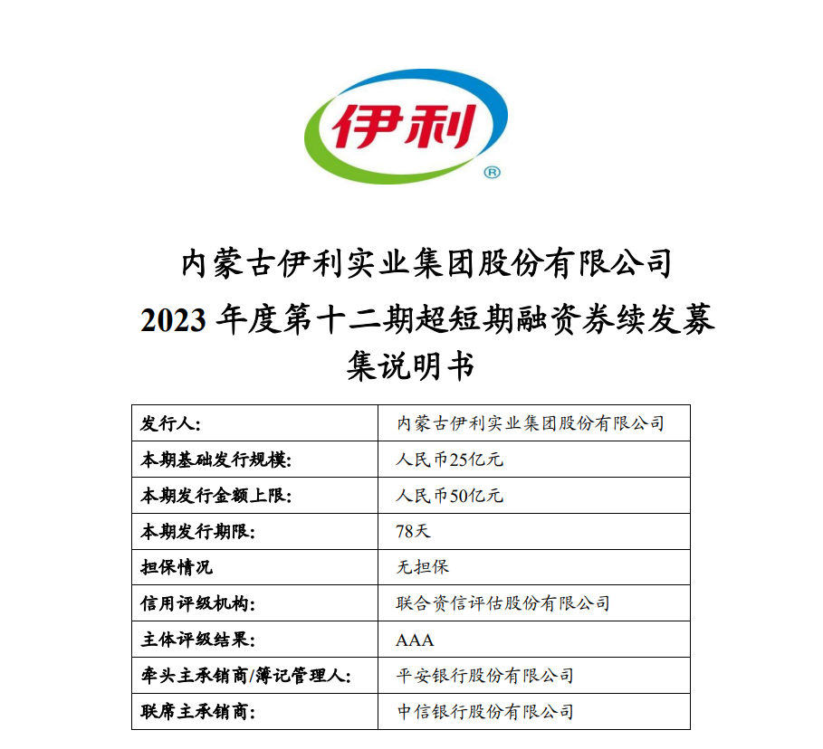 【大河财立方消息】7月6日,据上海清算所,内蒙古伊利实业集团股份有限公司披露2023年度第十二期超短期融资券发行方案。