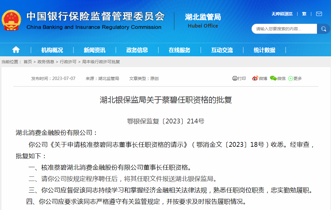 【大河财立方消息】7月7日消息,湖北银保监局批复,核准蔡碧湖北消费金融股份有限公司董事长任职资格。