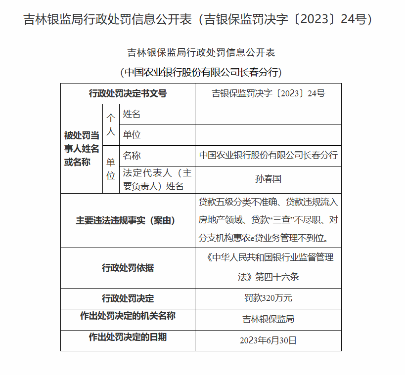 【大河财立方消息】7月7日,据国家金融监管总局网站,吉林银保监局日前对中国农业银行股份有限公司长春分行开出320万元罚款,6名相关责任人被予以警告处分。