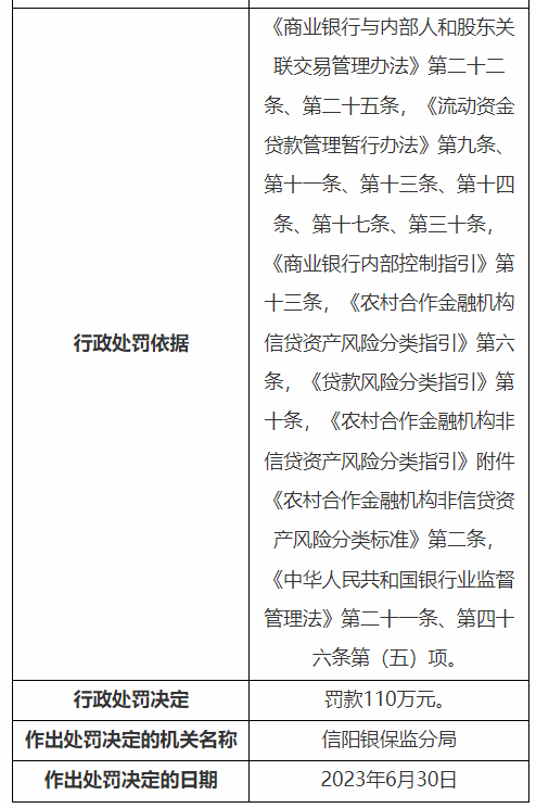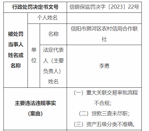 处罚信息显示,浉河区农信社存在:重大关联交易审批流程不合规;贷款三查未尽职;资产五级分类不准确等违法违规事实,信阳银保监分局对其罚款110万元。刘礼奎、唐备作为责任人受到警告处分。
