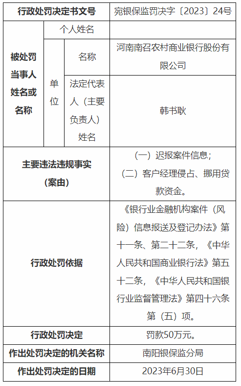 处罚信息显示,南召农商行存在:迟报案件信息;客户经理侵占、挪用贷款资金等违法违规事实,南阳银保监分局对其罚款50万元。柴大刚作为责任人受到警告处分。