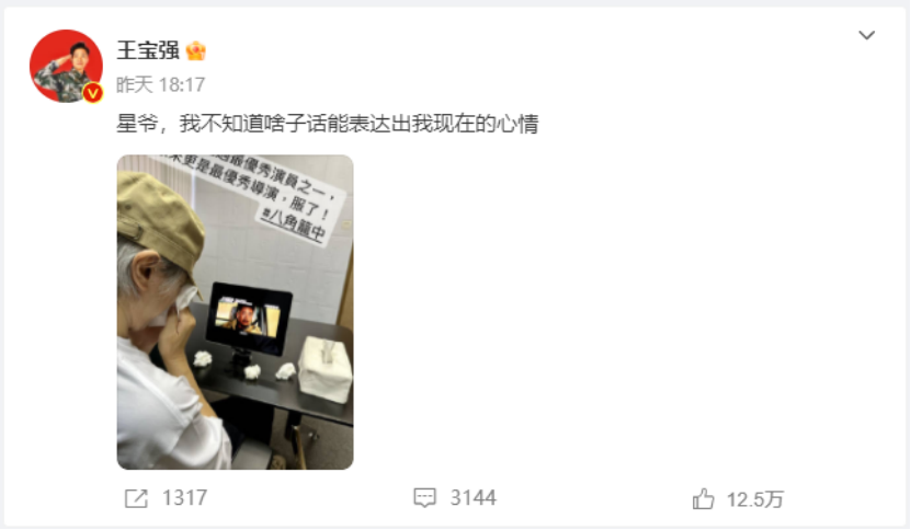 周星驰更是边看边落泪,配文表示 “宝强是我见过最优秀演员之一,原来更是最优秀导演,服了”。星爷给出如此高的评价,也让王宝强十分激动,发文称无法形容现在的心情。