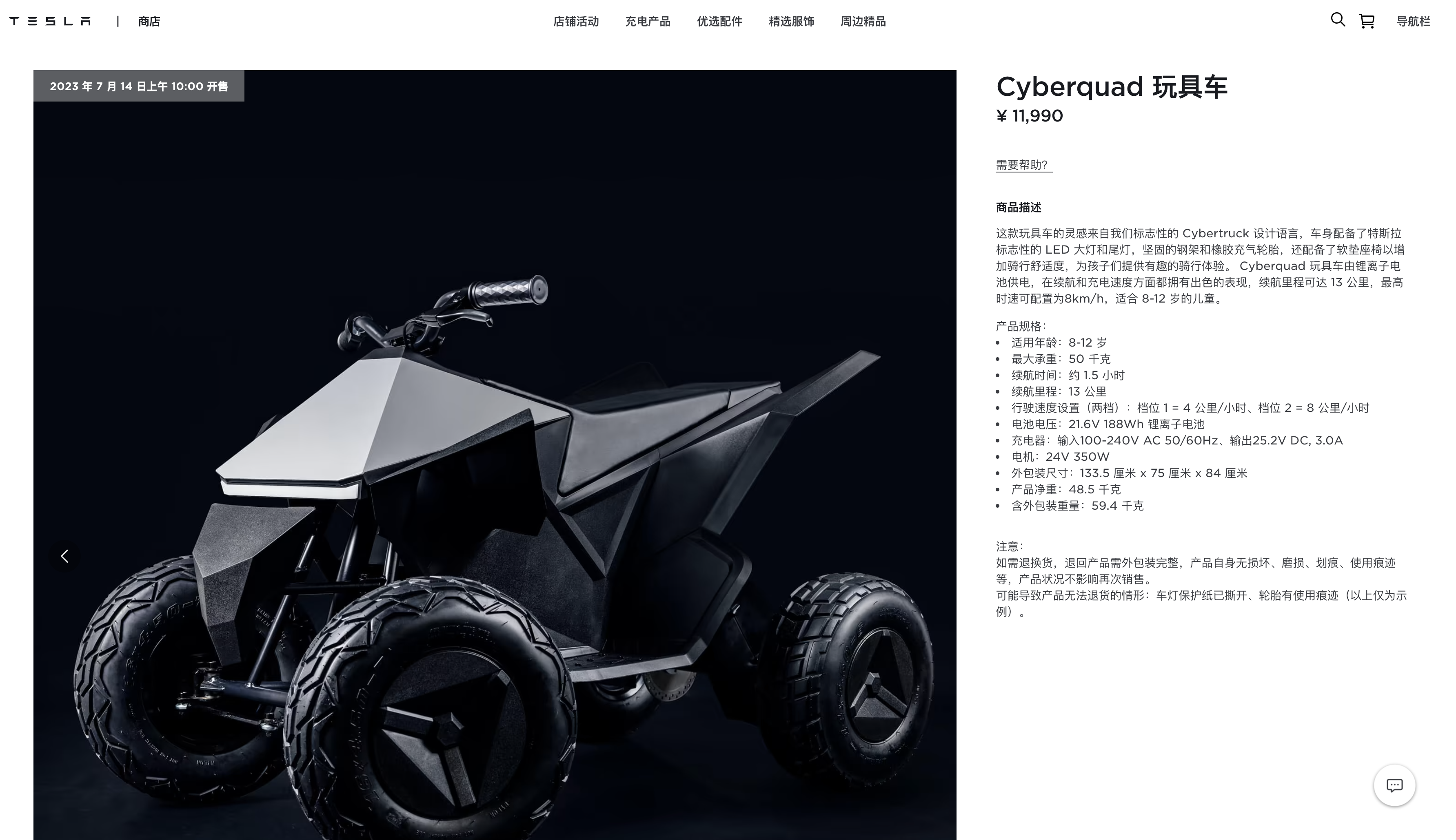 7月13日,特斯拉中国官网正式公布Cyberquad玩具车售价——11990元。7月14日上午10点,该产品将在特斯拉中国官网在线商店、天猫/京东特斯拉官方旗舰店正式开售。
