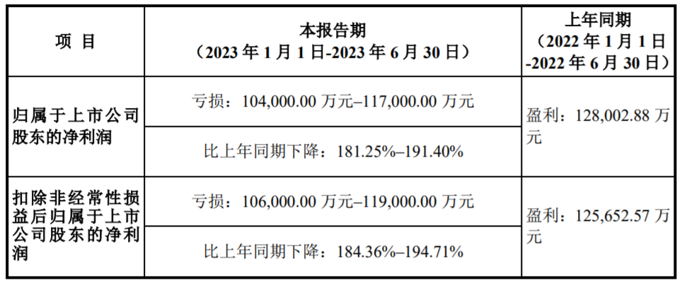 【大河财立方消息】7月16日,德方纳米披露上半年业绩预告,预计上半年归属于上市公司股东净亏损10.4亿元~11.7亿元,同比由盈转亏,预计扣除非经常性损益后亏损10.6亿元~11.9亿元,同比由盈转亏。