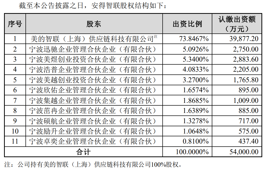 公开资料显示,安得智联是一家致力于为客户提供端到端数智化供应链解决方案的物流科技企业。注册资本54000万元人民币,注册地址为芜湖经济技术开发区清水河路99号,经营范围涉及供应链管理服务、国内货物运输代理、仓储设备租赁服务(除许可业务外,可自主依法经营法律法规非禁止或限制的项目)等。