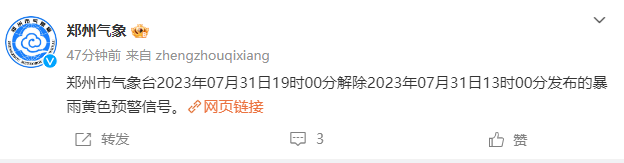 郑州市气象台2023年7月31日19时00分解除2023年7月31日13时00分发布的暴雨黄色预警信号。