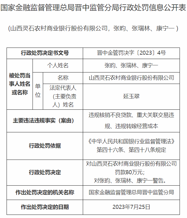 山西灵石农村商业银行股份有限公司因存在违规核销不良贷款、重大关联交易违规、违规转嫁经营成本等违法违规事实,被罚款80万元,张昀、张瑞林、康宁一受到警告处分。