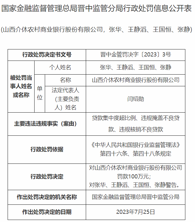 其中,山西介休农村商业银行股份有限公司因存在贷款集中度超比例、违规掩盖不良贷款、违规核销不良贷款等违法违规事实,被罚款100万元,张华、王静滔、王国恒、张静受到警告处分。