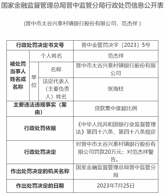 晋中市太谷兴泰村镇银行股份有限公司因存在贷款集中度超比例等违法违规事实,被罚款20万元,范杰祥受到警告处分。