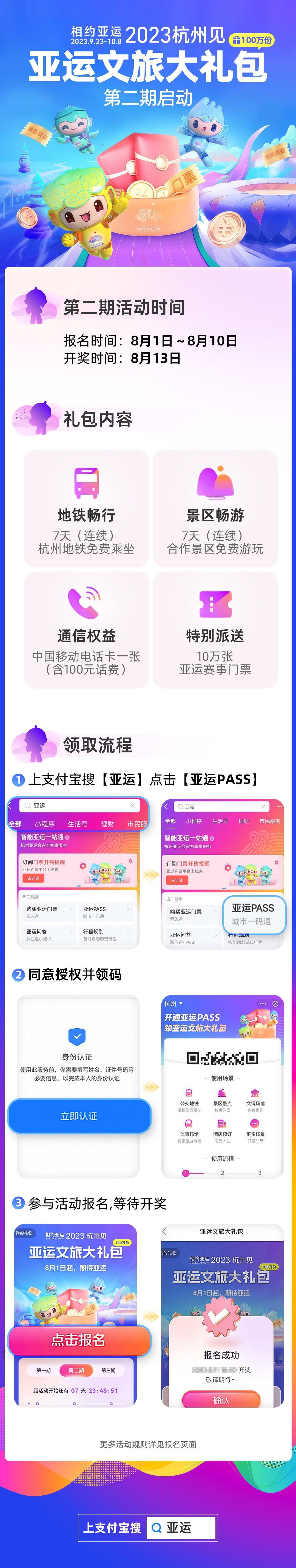 【大河财立方 记者 杨霄 实习生 王曼迪 青明慧】借亚运会之机,杭州8月1日向全国公众派发第二期亚运文旅大礼包,主要包括杭州地铁畅行、48家杭州市景点门票、百元话费电话卡及10万张免费亚运门票等。即日起,公众上支付宝搜“亚运”,进入智能亚运一站通、点击“亚运PASS”即可完成在线报名。该平台将在8月13日抽取获奖用户。