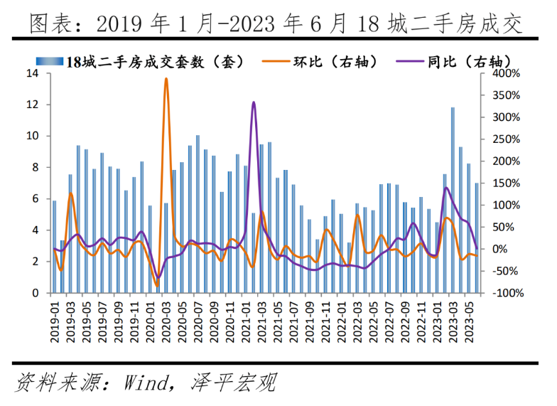 二手房销售:4-6月成交环比由正转负、连续三个月下降,月均下降幅度超10%。2023年5月、6月,18个样本城市二手房分别成交8.3、7.0万套,环比增速-11.3%、-15%,不及2019-2022年二手房成交表现;同比延续之前的增长态势,分别变化56.4%、1.1%,但较2-4月分别增长135.4%、106.6%、70.2%的涨幅明显收窄。2023年4月,一线、二线、三四线城市环比增速均由正转负、并连续下降至6月份;各线城市同比均保持正增长,但涨幅呈明显收窄趋势。