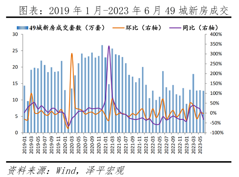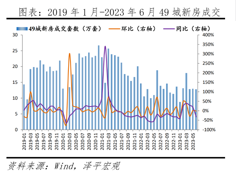 2023年5、6月,49个样本城市新房分别成交13.0、12.8万套,不及2022-2019年5、6月平均成交规模的14.9、23.3、22.6、20.8万套,成交明显乏力。