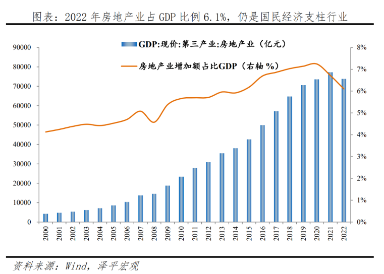 (一)房地产是国民经济的重要支柱,2022年房地产业增加值为7.3万亿元,占GDP的6.1%
