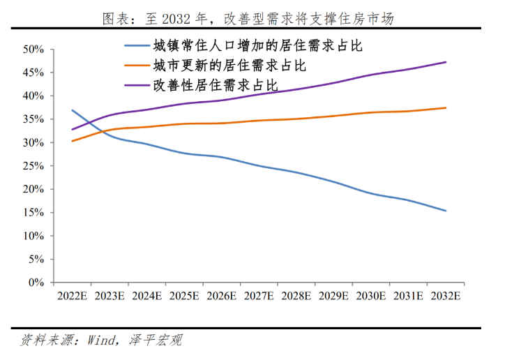 2023年我国每年新增城镇居住需求约12亿平方米,城镇常住人口增加(剔除行政区划变动,后同)、居住条件改善、城市更新需求分别占总需求的31.5%、32.7%、35.8%。2032年总需求波动降至10亿平方米,城镇常住人口增加、居住条件改善、城市更新需求分别占总需求的15.4%、37.4%、47.2%。改善性需求总量、占比均呈现逐年增长趋势,2023年后有望超越城镇常住人口增长带来的需求成为最大的需求。