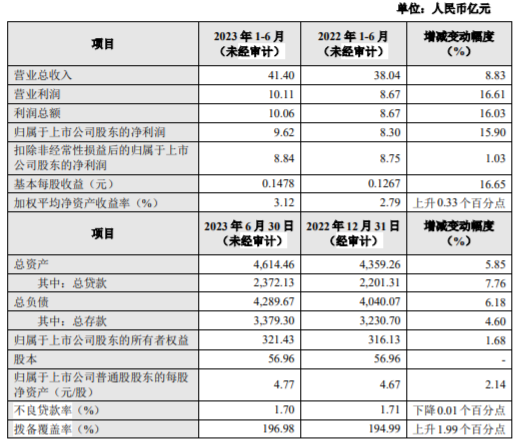 业务规模方面,上半年创历年来半年度营业收入最好水平。报告期内,该行实现营收41.40亿元,较上年同期增长3.36亿元,增幅8.83%;实现归属于上市公司股东的净利润9.62亿元,较上年同期增长1.32亿元,增幅15.90%。截至2023年6月末,该行总资产4614.46亿元,较年初增长255.20亿元,增幅5.85%;归属于上市公司股东的所有者权益321.43亿元,较年初增长5.30亿元,增幅1.68%。