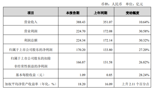 公告显示,上半年,江苏银行实现营业收入388.43亿元,同比增长10.64%;归属于上市公司股东的净利润170.20亿元,同比增长27.20%。截至上半年末,该行资产总额32945.83亿元,较上年末增长10.55%。