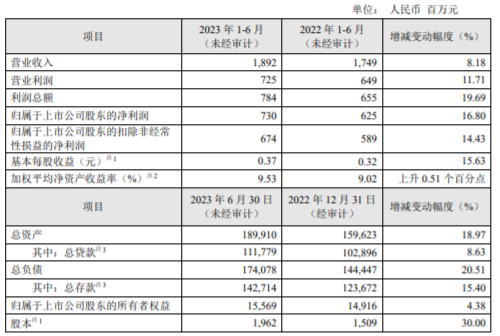 公告显示,2023年上半年,瑞丰银行实现营业收入18.92亿元,同比增长8.18%;归属于上市公司股东的净利润7.30亿元,同比增长16.80%。截至2023年6月末,该行总资产达1899.10亿元,较年初增长18.97%。