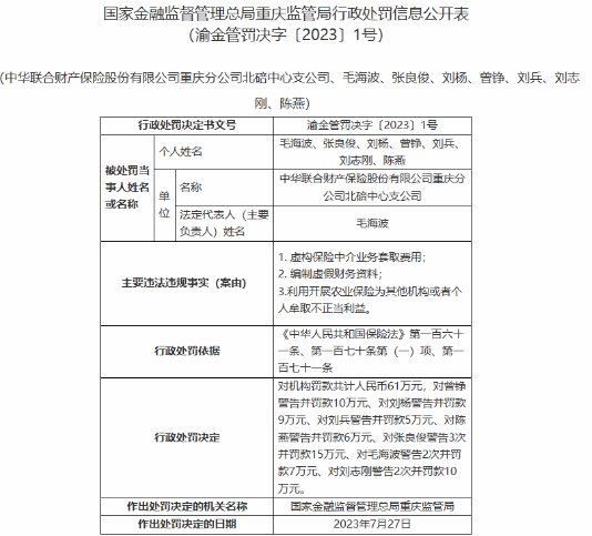 依照相关法规,国家金融监督管理总局重庆监管局对中华联合财产保险股份有限公司重庆分公司北碚中心支公司处罚款61万元;同时对曾铮警告并罚款10万元、对刘杨警告并罚款9万元、对刘兵警告并罚款5万元、对陈燕警告并罚款6万元、对张良俊警告3次并罚款15万元、对毛海波警告2次并罚款7万元、对刘志刚警告2次并罚款10万元。